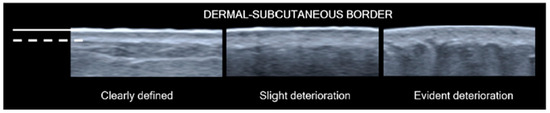 Greyscale ultrasound images of dermal-subcutaneous tissue layer border integrity. Borderlines of the epidermis (solid line) and dermal-subcutaneous border (dotted line) are indicated in white markings. A clearly defined border appears as a bright, uninterrupted hyperechoic line that separates the tissue layers with minor undulation along the border length (left). Slight border clarity deterioration is demarcated by a loss in contrast to echogenicity between tissue layers (middle). Evident deterioration of border integrity with the borderline interrupted by large serrations extending between tissue layers (right).
