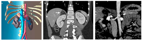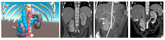 Virtual reality (VR) (a) and coronal computed tomography (CT) (b–d) images of a 10-year-old girl with a symptomatic right ptotic dysmorphic kidney. The figures show a ptotic right kidney, located inferior-medially and rotated, with normal parenchymal thickness. No urinary tract dilatation is noted. Three right renal arteries are present (→): one originates from the proximal aorta, one from the distal aorta, and one from the proximal common iliac artery; on the left, two contiguous renal arteries are depicted, and the left renal vein runs posteriorly to the aorta.