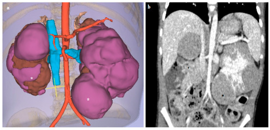 Virtual reality (VR) (a) and preoperative computed tomography (CT) (b) images of a 3-year-old girl with bilateral nephroblastomatosis (*). Both kidneys are in place, enlarged in size (right kidney 8 cm, left kidney 9 cm), with the parenchymal structure altered due to the presence of multiple solid lesions, the largest of which are located, respectively, at the upper pole of the right kidney, rounded in appearance, approximately 4 cm in diameter, and at the lower pole of the left kidney, approximately 4.5 cm in diameter. The lesions all have a nearly rounded morphology, and defined margins, albeit without a clear capsular structure.