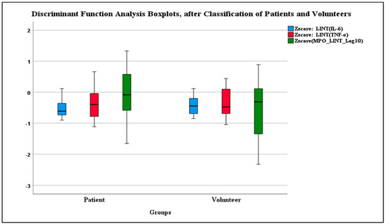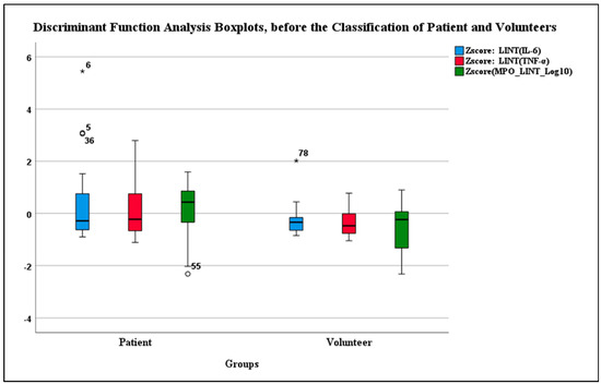 Discriminant Function Analysis (DFA) boxplots facilitated the stratification of data originating from patient and volunteer samples. Compared to other classification techniques, such as logistic regression, support vector machines (SVM), and random forests, DFA demonstrated strengths in handling small sample sizes and non-normal data. The significant Box’s M test initially indicated issues with multivariate normality, which were addressed through iterative classification. This approach improved the model’s assumptions and enhanced classification accuracy, particularly given the erratic and non-normal data, as expected with biomarkers [