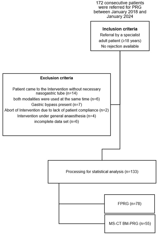 This retrospective study analyzed 172 successful percutaneous radiological gastrostomies (PRGs) performed at our university hospital from January 2018 to January 2024. Cases that significantly impacted procedure time—such as those deferred to the radiology department without a nasogastric tube, combined multislice CT biopsy mode (MS-CT BM) and fluoroscopy-guided PRG (FPRG), prior gastric bypass, non-compliance, need for general anesthesia, or incomplete data—were excluded to ensure a more accurate comparison between the groups (see Figure 1).