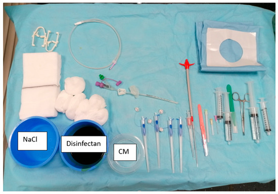 Intervention material used. Avanos Introducer Kit for Gastrostomy Feeding Tube with four SAF-T-PEXY T-Fasteners next to CM = contrast media, 10 mL lopamiro 300 diluted with sodium chloride with a ratio 1:2; Bracco Suisse SA, Cadempino, Switzerland; Flocare® Gastro Tube CH 14 in the middle. A 0.035″ J-tip guidewire above the gastric tube. Lidocaine 1% in the bigger syringe. 10 mL sterile water in the other syringe, Aqua ad iniectabilia Bichsel; Large pharmacy Dr. G. Bichsel AG, Interlaken, Switzerland; NaCl = sodium chloride.