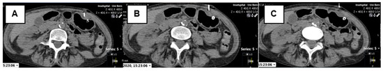 All procedures were reviewed by a resident with four years of experience and a board-certified interventional radiologist with seven years of experience. Neither of them performed or participated in any of these interventions. We recorded patient demographics, radiation exposure parameters (Dose Length Product (DLP)/Dose Area Product (DAP)), procedural time (in minutes), success rate, and complications. The respective dose product was converted into the effective dose (millisievert (mSv)) using accessible approximation formulas and calculators [14,15]. Procedural time was defined as the interval from the first to the last acquired image in the Picture Archiving and Communication System (PACS). Intervention-related information, such as complications, was collected from the electronic patient file from one day before to three months after insertion (regular tube replacement). Complications were categorized as minor (superficial wound infection, minor leakage, dislodgment, hematoma in the abdominal wall) or major (hemorrhage, peritonitis, wound infection, perforation/tear, aspiration, tube displacement, sepsis) according to Kandarpa et al. [16].