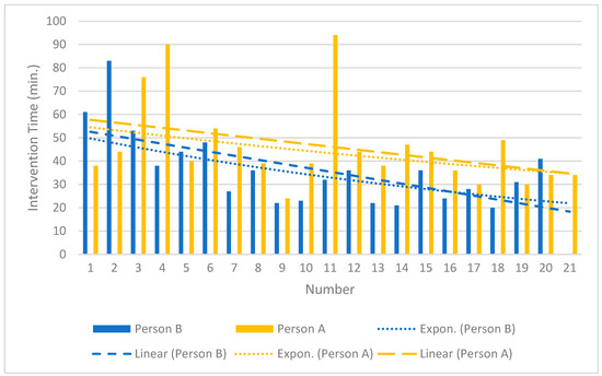 The effective radiation dose differed significantly and was, on average, about 65 times higher for MS-CT BM-guided PRG than for FPRG (p < 0.001). The procedural times also differed significantly, with FPRG being performed 41% faster on the mean (p < 0.001). Derived from the data of the interventionalists who have performed MS-CT BM-guided PRG the most since its implementation in our institute (person A, n = 21; person B, n = 20), several interventions in the higher, single-digit range (8–9 for linear and 6–10 for exponential learning curve shape [17]) were necessary to initially reduce the average procedural time by 10 min (Figure 4).