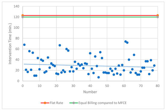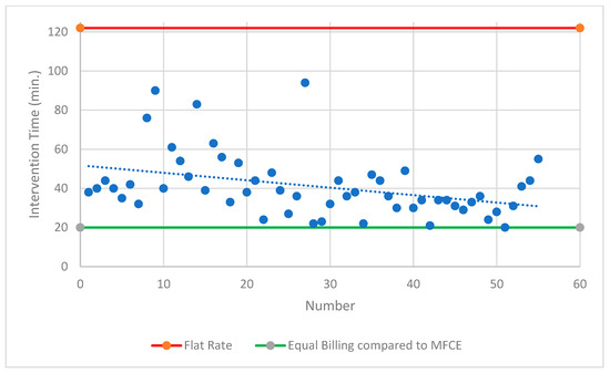 Both intervention modalities undercut the specified procedural time according to the current TARMED flat-rate tariff. A comparison with the most frequent comparable examination showed that only 4% of MS-CT BM-guided PRGs achieved the same level of reimbursement. A comparable deficit of CHF 572.11 was achieved in 89% of MS-CT BM-guided PRG cases (<60 min procedure time). In contrast, FPRGs were always the superior intervention modality (Figure 5 and Figure 6).