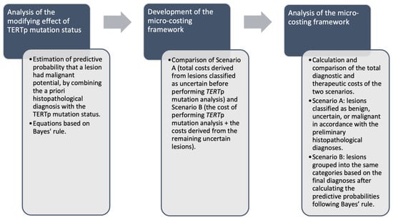After designing the processes (Figure 1) and determining the costs for each of them, the total diagnostic and therapeutical costs were calculated and compared for the two scenarios. In the first scenario (A), the lesions were classified as benign, uncertain, or malignant in accordance with the preliminary histopathological diagnoses. In the second scenario (B), they were grouped into the same categories based on the final diagnoses after performing the TERTp mutation analysis and the predictive probabilities were calculated following Bayes’ rule.