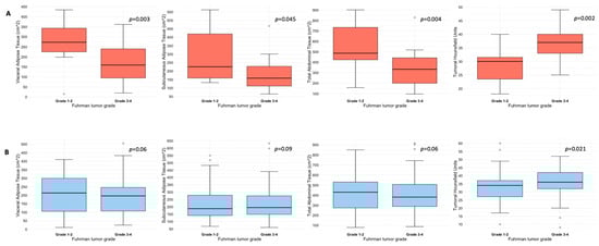 Box and whisker plots depicting adipose tissue compartments measurement and tumoral HU according to ADFP expression ((A), yes vs. (B), no) and Fuhrman tumor grade.