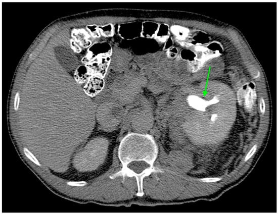 Axial CT image during excretory phase showing ccRCC with AFDP gene expression with hydronephrosis (green arrow).