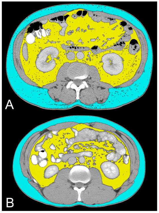 Total abdominal tissue (TAT), visceral adipose tissue (VAT), and subcutaneous adipose tissue (SAT) were measured using a semi-automatic function of Horos v.4.0.0 RC2 software, which allowed us to analyze all cross-sectional CT images by selecting the typical HU values of the adipose tissue. The data were obtained as areas (cm2) on a single axial image located 3 cm above the lower edge of L3, as previously described [21].