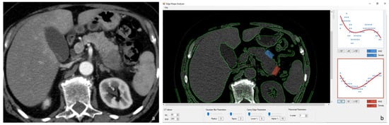 Postcontrast arterial MDCT axial image of adenocarcinoma of the tail of the pancreas (a). Screenshot of the GUI of the software used (b) with blue box positioned on normal parenchyma and the red box positioned on an adenocarcinoma of the tail of the pancreas. The graphic output of the results from the Canny edge detection and the subsequent average boundary line for both the boxes selected are visible.