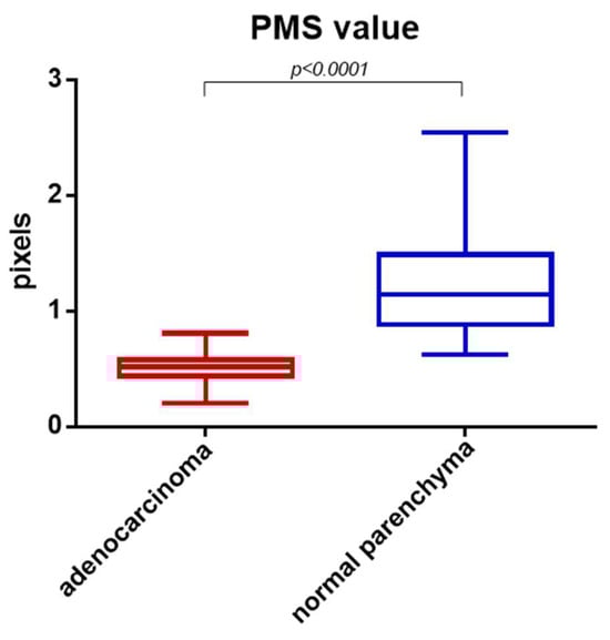 PMS values of cancerous and healthy pancreatic borders (whisker plot).
