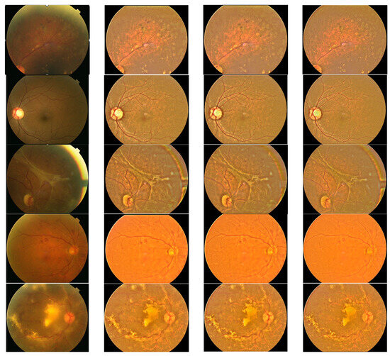 - Palanisamy, G.; Ponnusamy, P.; Gopi, V.P. An improved luminosity and contrast enhancement framework for feature preservation in color fundus images. Signal Image Video Process. 2019, 13, 719–726. [Google Scholar] [CrossRef]