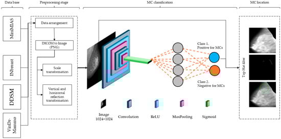 This section describes the nature of the database used for training, validation, and testing, as well as a detailed description of the methodology at each stage to test the hypothesis that descriptive features based on intensity characteristics, enhanced with a CNN, could achieve acceptable performance for the detection and localization of microcalcifications (MCs). Figure 1 presents an overview of the process.