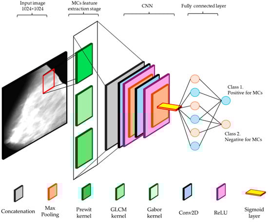where i and j represent the gray levels of the pixels. The distance d is the separation between the pixel pairs, and the angle θ defines the orientation between the pixel pairs. The offsets Δx and Δy correspond to the horizontal and vertical distances, respectively, determined by the angle θ. Lastly, m and n denote the dimensions of the image. Each kernel serves an important function in highlighting the distinctive features of microcalcifications, including their texture, size, and shape. The qualities of the MCs are comprehensively represented by the features that were retrieved from these kernels. These features will subsequently be concatenated and utilized as inputs to the first layer of the CNN, thereby enhancing the model’s ability to accurately detect and classify microcalcifications in mammographic images. This integration of traditional feature extraction methods with deep learning techniques aims to improve the precision and reliability of automated mammographic analysis.