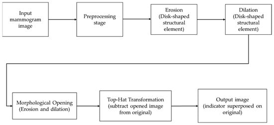 Pipeline for localizing MCs in mammographic images. The process includes preprocessing, applying morphological operations (erosion and dilation) with a disk-shaped structuring element, and using the Top Hat transformation to highlight microcalcifications in the final processed image.