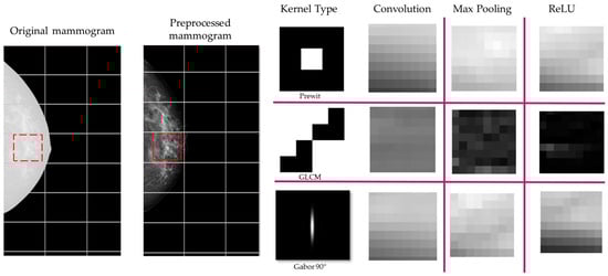 In this regard, three types of filters were proposed to mimic the detection of the characteristics: Prewitt, Gabor, and GLCM. These filters have the particularity of enhancing the visibility of microcalcifications by emphasizing different aspects of the mammogram. The Prewitt filter is used for edge detection and helps highlight the boundaries of microcalcifications by identifying areas with high spatial gradients. It is effective in enhancing linear and irregular patterns, making it easier to detect microcalcifications that may have indistinct edges []. The Gabor filter, known for its ability to capture texture information, can enhance the visualization of microcalcifications with specific orientations and frequencies. It is particularly useful for detecting microcalcifications that have distinct texture patterns, improving their contrast against the background tissue []. The Gray Level Co-occurrence Matrix (GLCM) method focuses on the textural features of the mammogram by analyzing the spatial relationship of pixel intensities. GLCM can highlight areas with varying densities and patterns, which are indicative of suspicious microcalcifications. It provides detailed information on the texture and structure of the tissue, aiding in the differentiation of benign and malignant calcifications []. By combining these filters, the algorithm can effectively enhance the relevant density features associated with microcalcifications, aiding their detection and localization.