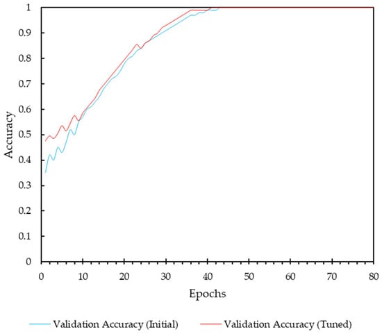 Figure 7, depicts the validation accuracy over 80 epochs, comparing the initial configuration with the tuned hyperparameters. While there is a noticeable improvement in the accuracy during the early stages of training, the overall impact of hyperparameter tuning appears to be small with a ΔAccuracy = 0.01875. In the initial epochs (up to around epoch 20), the tuned model shows a more consistent increase in validation accuracy compared to the initial configuration. This suggests that the adjusted hyperparameters contributed to a more stable and efficient learning process. The introduction of dropout and L2 regularization in the tuned model helped control overfitting, as evidenced by the smoother accuracy curve. However, these techniques alone were not sufficient to yield a substantial improvement in final validation accuracy, suggesting that the model architecture and the dataset’s characteristics were well-suited for the task even without aggressive regularization.