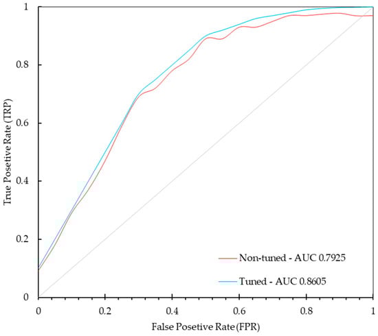 To evaluate the performance of both models, the ROC curves were plotted and the Area Under the Curve (AUC) values were computed. The ROC curves for both models are depicted in Figure 8, illustrating the little improvement in performance after hyperparameter tuning. The AUC values for the non-tuned and tuned models are 0.7925 and 0.8605, respectively. The ROC curve for the tuned model shows a higher true positive rate (sensitivity) at various thresholds, suggesting better diagnostic performance. The results highlight the effectiveness of the hyperparameter tuning process, enhancing the model’s ability to accurately detect MCs.