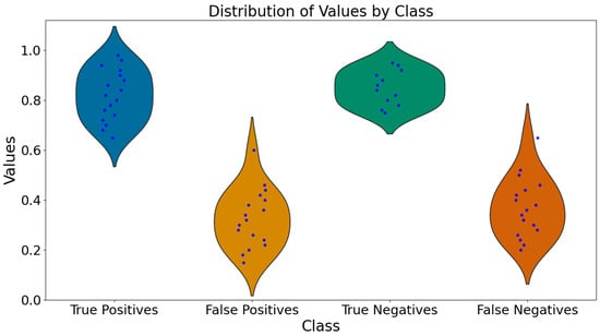 Violin plots of predicted probabilities for true positives, false positives, true negatives, and false negatives. The plots display the distribution of predicted probabilities, combining box plots and density plots to provide a comprehensive view of the data.