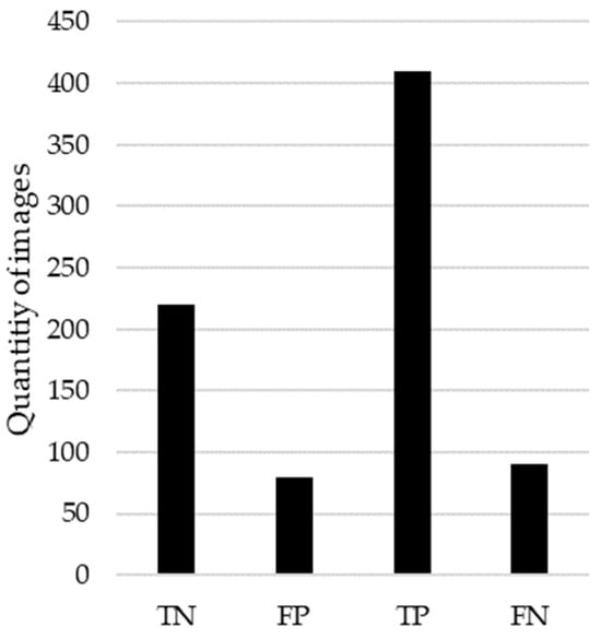 To assess the performance of our model in predicting the localization of MCs), a radiologist with 2 years of experience assisted in this study. The radiologist manually reviewed the mammograms classified by the model and provided an assessment of the model’s performance. For this analysis, we used the correctly predicted mammograms from both the test and validation datasets. Specifically, the test set comprised 569 mammograms, out of which 410 were true positives (correctly identified as having MCs), and 420 were true negatives (correctly identified as not having MCs). Additionally, the validation set consisted of 1138 mammograms. Based on these metrics, we inferred that approximately 935 mammograms were correctly predicted as positives (having MCs), and approximately 1041 mammograms were correctly predicted as negatives (not having MCs), according to the radiologist. It is important to note that verifying a large quantity of mammograms can be a tiring task, especially when some cases involve repeated mammograms due to the data augmentation stage. This study highlights the importance of creating tools to facilitate these tedious tasks, highlighting the necessity for automated systems in improving the efficiency and accuracy of mammogram analysis. Figure 10 presents the results of the radiologist’s findings according to the correctly classified cases, both for the presence and absence of microcalcifications (MCs).