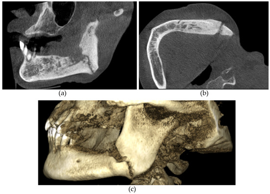 (a) Sagittal and (b) axial sections and (c) 3D reconstructed image demonstrating a left angle of the mandible pathological fracture resulting from stage III MRONJ.