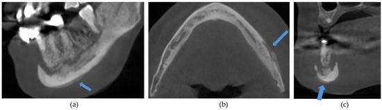 - Yfanti, Z.; Tetradis, S.; Nikitakis, N.G.; Alexiou, K.E.; Makris, N.; Angelopoulos, C.; Tsiklakis, K. Radiologic findings of osteonecrosis, osteoradionecrosis, osteomyelitis and jaw metastatic disease with cone beam CT. Eur. J. Radiol. 2023, 165, 110916. [Google Scholar] [CrossRef] [PubMed]