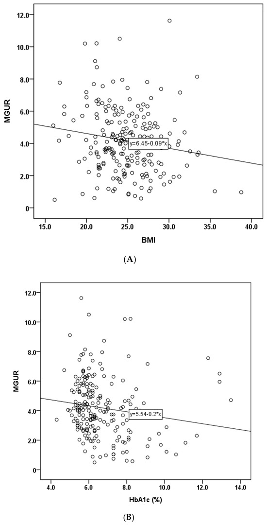 Correlation analysis of clinical factors and MGUR revealed significant negative correlations of MGUR with BMI (r = −0.162, p = 0.018), HbA1c (r = −0.150, p = 0.030), and triglycerides (r = −0.137, p = 0.046). Scatter plots of these significant factors are depicted in Figure 3 (panels A, B, and C). No significant correlations were observed between MGUR and other clinical factors such as age, height, weight, ejection fraction (EF), troponin T, CK-MB, fasting BST, loading BST, injection BST, insulin, creatinine, total cholesterol, HDL, or LDL. Results of univariable and multivariable linear regression analysis of clinical factors with MGUR are presented in Table 2. BMI (p = 0.032) and HbA1c (p = 0.050) were found to be independently correlated with MGUR. The regression model accounted for 21.0% of the variance in MGUR, as indicated by an R-squared value of 0.210. The adjusted R-squared value of the model was 0.035. The F-statistic for the model was 4.775, with a corresponding p-value of 0.009, indicating an overall statistical significance of the regression model.
