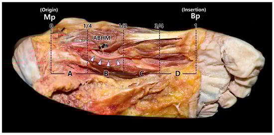 The nerve endings of the medial plantar nerve were observed at several locations within each muscle, predominantly in areas B and C (Figure 3). In 100% of cases, nerve endings were identified in areas B and C, approximately in the central region of the ABHM. Additionally, they were found in areas A and D in 75% and 60% of cases, respectively (Table 1).