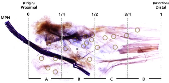 The stained specimens were inspected using an LED light box that provided sufficient light to reveal the intramuscular pathways of nerve branches. The nerve entry points were dissected and analyzed before Sihler’s staining to maintain their original location. The ABHM was virtually sectioned into four equal parts, each representing a quarter (25%) of the total length, labeled A, B, C, and D. Within each of these areas, the nerve entry points and areas where the nerve endings were detected were marked, and the data are presented as percentages (in areas A, B, C, and D). These comprehensive analytical methods identified the location of the most common nerve entry points and areas with the highest concentration of nerve endings in the ABHM.