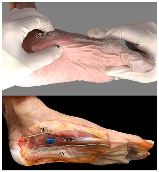 The ABHM is located in the superficial layer of the foot and extends from the medial process of the calcaneal tuberosity to the base of the proximal phalanx of the great toe. In addition, it covers the origin of the plantar vessels and nerves along the medial border of the foot and forms the medial border of the resulting tarsal tunnel [11]. The ABHM is a potential pain site on the medial side of the foot and is associated with hallux valgus, plantar fasciitis, and plantar heel pain syndrome [1,2,3,4]. Various therapeutic approaches, including dry needling and injection of anesthetics or BoNT into the ABHM, are used clinically to reduce the pain associated with the aforementioned disorders [1,2,3,4,5].