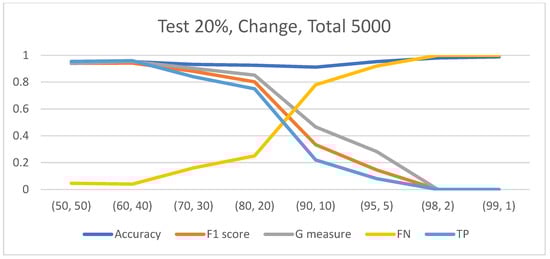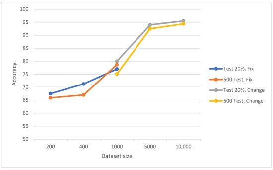 Our study employed various evaluation techniques for the classification model, including manipulating the dataset size, adjusting the imbalance ratio of class samples, and modifying the distribution of the dataset among training, validation, and testing. In the case of binary classification, when working with a balanced dataset, the results revealed consistent patterns across all four data-split methods utilized. As the size of the training dataset increased, enhancements in the system’s accuracy were observed, as depicted in Figure 3. For instance, when combining the “Test 20%” method with the “Change” approach, the accuracy rose from 80% for a training data size of 1000 images to 94% for 5000 images. Similarly, when employing the “Test 500” method in conjunction with the “Change” technique, the accuracy increased from 75.1% for a training data size of 1000 images to 92.5% for 5000 images.