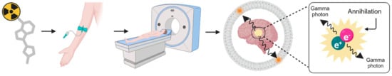PET imaging is based on the principle of radioactivity tracer imaging, which involves injecting a radioactive tracer into the bloodstream []. Radiotracers are substances labeled with radioactive unstable isotopes. These isotopes undergo radioactive decay over time, emitting positrons (e+), which interact with electrons (e−) in biological systems, which ultimately leads to two annihilation photons detected in a PET scanner. Detectors in the scanner capture annihilation photons to create images that, depending on the tracer, detect biochemical features of physiological parameters (Figure 1).
