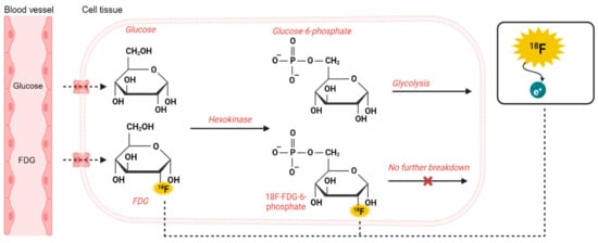 The brain consumes approximately 20% of the body’s total glucose demand []. For the measurement of glucose metabolism, PET exploits the first step of glycolysis, the initial stage of producing energy in the form of ATP in the cells. Here, the enzyme hexokinase phosphorylates the glucose molecule, trapping it within cells and initiating its metabolism []. FDG is a glucose analogue labeled radiotracer with a radioactive fluorine isotope (18F) with a radioactive half-life of 109.8 min []. FDG acts as glucose but is not metabolized beyond hexokinase (Figure 2), which characterizes FDG as an irreversible tracer.