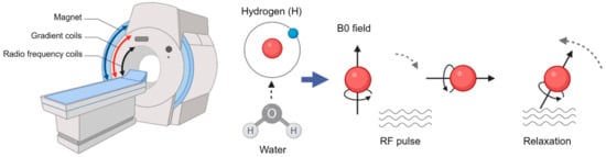 MRI is a non-invasive imaging technique that uses strong magnetic fields and radio waves to generate detailed images of the brain’s internal structures and function []. A major contribution of MRI to neuroimaging is structural MRI, providing high-resolution images of anatomical features in the brain, for example gray and white matter. For structural anatomical images, MRI relies on the behavior of hydrogen atoms in the water molecules of the body, specifically the protons within them. In the scanner, the protons are initially in a state of equilibrium subjected to the main magnet field B0. The protons are then excited by radiofrequency pulses and the variations in relaxation times and signal intensities in different tissues allow generation of detailed images (Figure 3). The gradient coils vary the strength of the field along axes (X, Y, and Z), enabling precise spatial localization of signals.