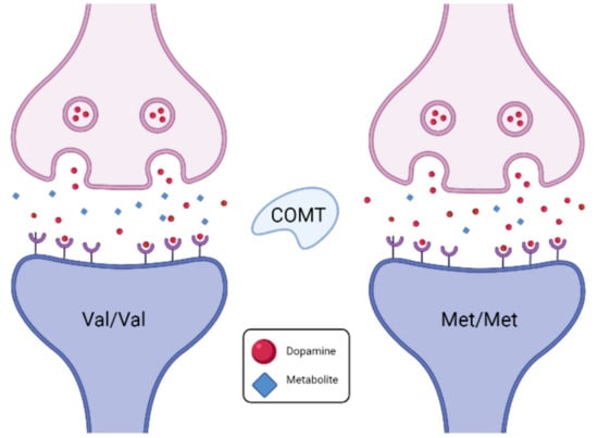 The COMT gene, described as the Warrior/Worrier gene [], codes for the catechol-O-methyltransferase enzyme, which breaks down dopamine in the prefrontal cortex. The wild-type G allele codes for valine (Val), whereas the A allele polymorphism changes the amino acid to methionine (Met). The altered composition causes the activity of the enzyme to be reduced to 25% of the wild type. As a result, A allele carriers have more synaptic dopamine in their prefrontal cortex [], which is considered advantageous for prefrontal function and related executive and cognitive function (Figure 4) [,].