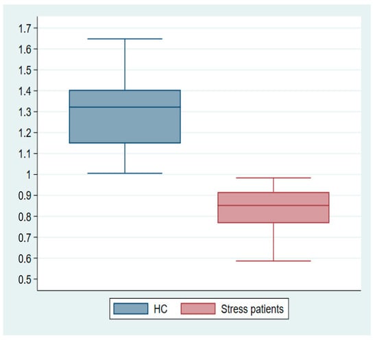 Regarding our results on genotyping, they do not appear to support the theory of the Val/Val Warrior variant being more stress resilient than the Met/Met Worrier variant. In fact, the genotypes of the stress patients included in this study are fairly equally represented by the homozygous genotype as well as the heterozygous one although actually with a fewer of the Met/Met genotype. One could argue, however, that work-related stress in the modern labor market can be related to emotional stressors as well as to pressures associated with the ability to perform executive functions. This is consistent with the Val/Val variant showing a modest reduction in executive cognition performance and the Met/Met variant showing enhanced vulnerability to emotional stress []. For the HCs, the picture is even more ambiguous as the vast majority of the participants in our group are in the heterozygous Val/Met variant group. Therefore, the pathology and symptoms of the stress patients included in this study are not directly comparable to earlier findings, which indicates that Met allele genotypes are less able to process emotional stimuli and more likely to have an elevated risk for emotion-related psychopathology []. The latter includes a reduced ability to shift attentional focus away from aversive stimuli and hence an impaired ability to disengage attentional resources from perceived sources of threat [].