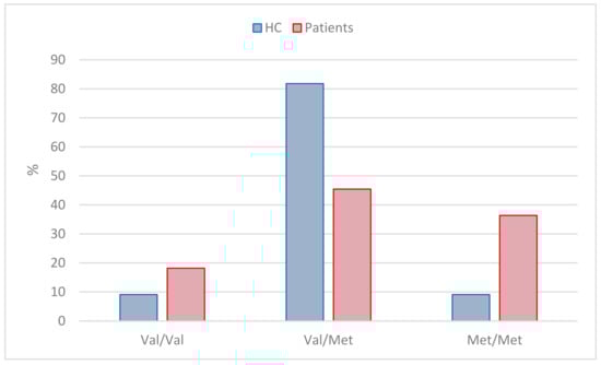 The homozygous Warrior allele Val/Val amounted to two (18%) in the patient group and one (9%) among the HC group; the heterozygous allele Val/Met amounted to fiive (46%) in the patient group and nine (82%) among the HC group, and the homozygous Worrier allele Met/Met amounted to four (36%) in the patient group and one (9%) in the HC group.