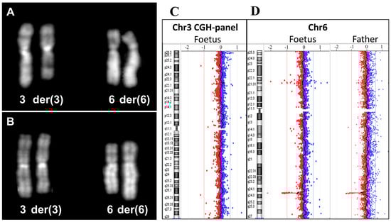 A 42-year-old G3P0 pregnant woman (2 first trimester miscarriages) was seeking prenatal diagnosis due to advanced age. On the first ultrasound, there was an increased nuchal translucency, 3.2 mm, while the general development was in the normal range. The combined test (PAPP-A and free beta-HCG) resulted in a high risk for trisomy 21, 1:5, and trisomy 13, 1:62. A chorionic villus sampling was performed at 12.5 weeks gestational age from cytotrophoblasts and after cultures of mesenchymal tissue; a male karyotype was observed with an apparently balanced translocation involving chromosomes 3 and 6 (A). The extension of the chromosomal analysis to parents showed the same translocation in the paternal karyotype and allowed us to define the breakpoints in 3q25.1 and 6q24.2 (B). The maternal karyotype was normal. At the same time, a CGH array was performed during a placental biopsy and deletion was evident: arr[GRCh37] 6q24.2(143512294_144136217,)x1 (C,D). The deletion was heterozygous, at a size of 624 Kb of chromosome 6 at cytoband q24.2, and it included the OMIM gene PEX3.