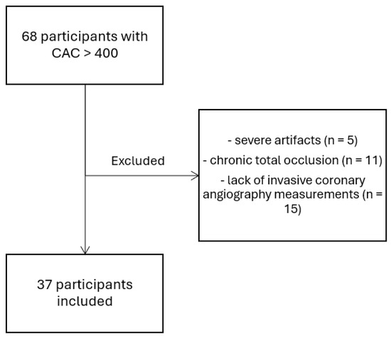 From May 2021 to March 2023, we included 68 participants who underwent elective CCTA with clinical suspicion for coronary artery disease and were found to have a CAC score of more than 400. Out of 68 participants, 5 were excluded due to severe artifacts, 11 due to chronic total occlusion of any coronary artery, and 15 were excluded due to lack of invasive coronary angiography measurements (Figure 1). Finally, our study included 37 participants who met all the inclusion criteria. Table 1 shows participant characteristics.