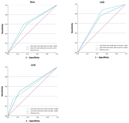 ROC curves of CCTA and cFFR for each coronary artery. RCA—right coronary artery, LAD—left anterior descending artery, LCX—left circumflex artery, AUC—area under the curve, CCTA—coronary computed tomography angiography, cFFR—one dimensional (1D) FFR analysis.