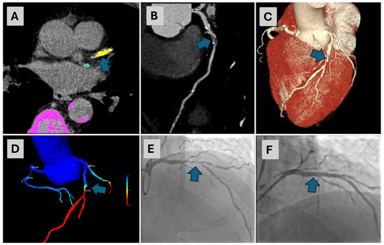 An 80-year-old male with a CAC score of 868.5, exhibiting prominent calcifications in the LAD artery ((A)—arrow), underwent CCTA. The CCTA revealed severe stenosis in the mid-segment of the LAD artery ((B)—arrow, (C)—arrow). A cFFR test confirmed a significant stenosis in the same segment ((D)—arrow), with a cFFR value of less than 0.7. Consequently, ICA was performed, which confirmed 80% stenosis in the LAD ((E)—arrow). This was followed by percutaneous coronary intervention (PCI) with stenting and the final angiography exam showed complete revascularization ((F)—arrow). CAC—coronary artery calcium, LAD—left anterior descending, CCTA—coronary computed tomographic angiography, cFFR—computed fractional flow reserve, ICA—invasive coronary angiography, PCI—percutaneous coronary intervention.
