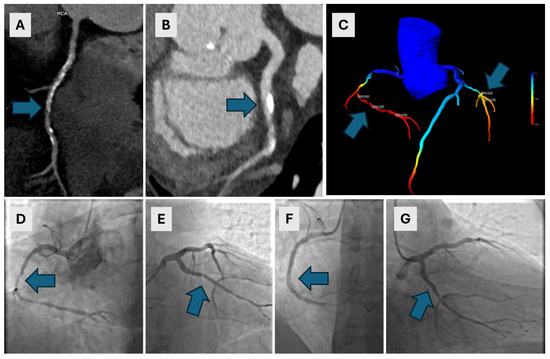 A 63-year-old male with a history of arterial hypertension and nonspecific arrhythmia underwent CCTA. The CAC score was 1406.7. Extensive calcified and mixed plaques were found in the RCA, with severe stenosis of up to 85% and in the RCA ((A)—arrow), and moderate stenosis of 65% in the LCX ((B)—arrow). A cFFR confirmed the significance of both lesions, with cFFR values of less than 0.7 in the RCA and 0.76 in the LCX ((C)—arrows). ICA revealed long 80–99% stenoses in the middle segment of the RCA ((D)—arrow) and a 90% stenosis in the proximal LCX ((E)—arrow). Immediate PCI of the RCA was performed with complete revascularization ((F)—arrow) which was complicated by anaphylactic shock. A few days later, after premedication, PCI of the LCX was performed with stent implantation and complete revascularization ((G)—arrow). CCTA—coronary computed tomographic angiography, CAC—coronary artery calcium, RCA—right coronary artery, LCX—left circumflex artery, cFFR—computed fractional flow reserve, ICA—invasive coronary angiography, PCI—percutaneous coronary intervention.