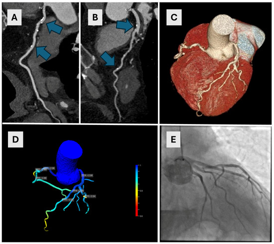 A 54-year-old male underwent CCTA for suspected ischemic heart disease. The CAC score was 417. Calcified plaques were found in both the RCA ((A)—arrows) and LAD ((B)—arrows) causing moderate stenoses (50–52% in the LAD and 63% in the proximal RCA). Image (C) shows a VRT reconstruction image of coronary arteries with multiple small plaques on LAD. A cFFR test showed no significant stenoses (D) which was subsequently confirmed on ICA (E). CCTA—coronary computed tomographic angiography, CAC—coronary artery calcium, RCA—right coronary artery, LAD—left anterior descending artery, VRT—volume rendering technique, cFFR—computed fractional flow reserve, ICA—invasive coronary angiography.