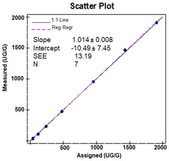 Linearity assessment was performed on two different Alinity C analyzers using seven levels of linearity materials in triplicate. In-house AFCAL assay showed a tight correlation and was found to be linearly proportional to the concentration of the mean of assigned and expected values (Table 2 and Figure 2). The mean recovery was 94.9% for all dilutions (with a minimum mean recovery of 78.1% and a maximum of 102.3% (Table 2)). The assay was linear over the tested AMR of 30–2000 µg/g. With 1:10 auto-dilution, the CRR was validated from 30 to 20,000 µg/g.