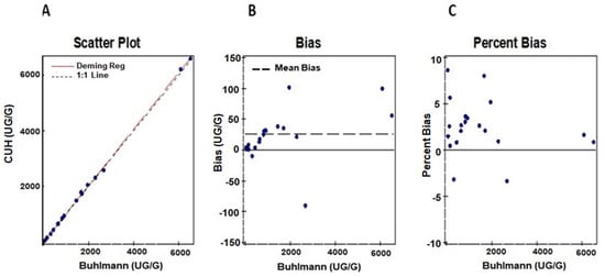 Method comparison studies were performed using n = 20 samples with known fCAL values provided by the vendor. Deming regression and Bland–Altmann plots for comparing in-house Buhlmann assay results against the predicate Buhlmann ELISA method are shown in Figure 3A–C. We observed a good correlation of r = 0.99 and an acceptable bias of 1.8% for the AFCAL assay compared to the predicate method.