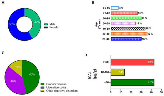 Data analysis of patient demographics and AFCAL results. (A) Percentage of male and female patients. (B) Age groups of patients tested for fCAL. (C) Percentage of patients tested for ICD codes for Crohn’s disease, ulcerative colitis, and other digestive disorders. (D) fCAL levels measured using Abbott Alinity C analyzer and percentage of patients in the normal, borderline, and abnormal fCAL level groups.