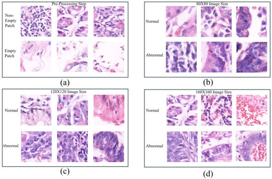 Empty patches are defined as those where more than half of the pixels have an RGB intensity value greater than 230 across all channels. The following is an overview of the empty patch removal procedure, including the proportion of empty patches deleted. In the 120 × 120 resolution dataset, 15.92% of patches were removed from the abnormal subclass, while 45.01% were removed from the normal subclass. For the 160 × 160 resolution dataset, 14.77% of patches were removed from the abnormal subclass, and 44.23% were removed from the normal subclass. In the 80 × 80 resolution dataset, 17.45% of patches were removed from the abnormal subclass and 45.54% were removed from the normal subclass. After eliminating the empty patches, the remaining patches were utilized to train the model. This preprocessing phase guaranteed that the dataset contained only relevant images, allowing the model to extract detailed visual characteristics for precise categorization. Figure 4 illustrates the count differences between empty patches, which are mostly backgrounds, and non-empty patches, which represent tissues in the histopathological images.
