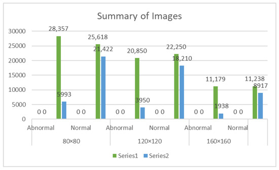 The Gastric Histopathology Sub-Size Image Database (GasHisSDB), with a link to the data available in the Supplementary Material, consists of 600 pictures of stomach cancer pathology obtained from a patient’s pathological slides (see Figure 1) obtained from a specific section of their gastrointestinal tract, each measuring 2048 × 2048 pixels. The images were obtained by scanning with a new USB camera at a magnification of 20. Four pathologists from Longhua Hospital at the Shanghai University of Traditional Chinese Medicine then provided tissue-specific labelling. In conjunction with five Northeastern University biomedical experts, the photos were cropped into 245,196 sub-sized gastric cancer pathology images. Two qualified pathologists from Liaoning Cancer Hospital and Institute calibrated these pictures. The dataset was then classed as aberrant or normal, with photographs reduced to three different sizes (160 × 160, 120 × 120, and 80 × 80) for each group. The dataset of gastrointestinal images is separated into three sizes: 80 × 80, 120 × 120, and 160 × 160. Each size category is further classified into two groups: abnormal and normal (see Figure 2b–d). The 80 × 80 size category has 81,390 photos, with 34,350 classed as abnormal and 47,040 labelled as normal. With regard to the 120 × 120 size category, there are 65,260 photos altogether, with 24,800 rated as abnormal and 40,460 as normal. Finally, in the 160 × 160 size group, there are 33,272 photos, with 13,117 classified as abnormal and 20155 as normal (as described in see Figure 3). In this project, the dataset of each class was divided into a five-fold cross validation.