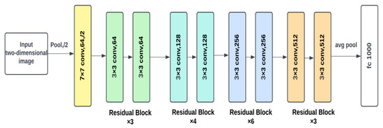 The design starts with an input layer that processes a two-dimensional picture, followed by a 7 × 7 convolutional layer with 64 filters and a stride of 2, which includes padding to retain spatial dimensions (see Figure 5). A max pooling layer with a stride of two decreases the spatial dimensions. The network is divided into multiple stages of residual blocks. The first stage consists of three residual blocks, each with two 3 × 3 convolutional layers with 64 filters and shortcut connections. The second stage consists of four residual blocks, each with two 3 × 3 convolutional layers and 128 filters. The first block down-samples the feature maps with a stride of two, and the shortcut connection adjusts dimensions. The third stage consists of six residual blocks, each with two 3 × 3 convolutional layers and 256 filters. The first block downscales with a stride of 2 and the shortcut connection adjusts appropriately. The last stage is made up of three residual blocks, each with two 3 × 3 convolutional layers and 512 filters. The first block down-samples with a stride of two, and the shortcut connection does the same. An average pooling layer then reduces spatial dimensions to 1 × 1, and the pooled feature maps are fed via a fully connected layer with 1000 output units, which correspond with the number of classes in the ImageNet dataset.