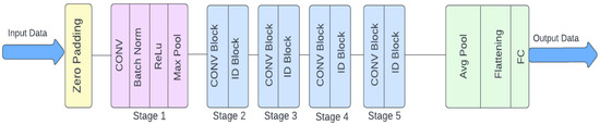ResNet50’s architecture handles two-dimensional input data using a succession of layers geared for effective feature extraction. It starts with zero-padding, then adds a convolutional layer, batch normalization, ReLU activation, and max-pooling to minimize spatial dimensions (see Figure 6). The network is organized into five phases, each of which contains convolutional and identity blocks. Stage 1 prepares the data, whereas Stages 2–5 contain convolutional blocks for down-sampling and identity blocks for deep feature extraction. Following these steps, an average pooling layer reduces the spatial dimensions to one by one, followed by a flattening layer and a fully linked layer for classification. The inclusion of identity blocks allows for the direct addition of input to output, which alleviates the vanishing gradient problem and enables deeper network training. This design facilitates the effective learning of complicated characteristics, hence improving image recognition performance.